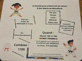 Prenez note que les cours de karaté pour les enfants de 14 ans et moins sont de retour au Dojo kenkyodokan de Sainte-Marie-de-Blandford, les mardis de 18 h à 19 h.